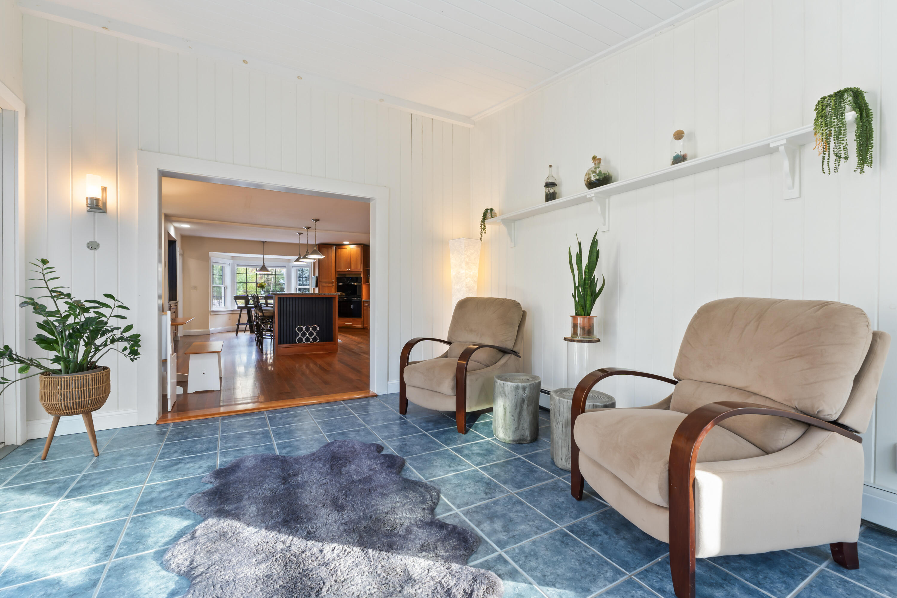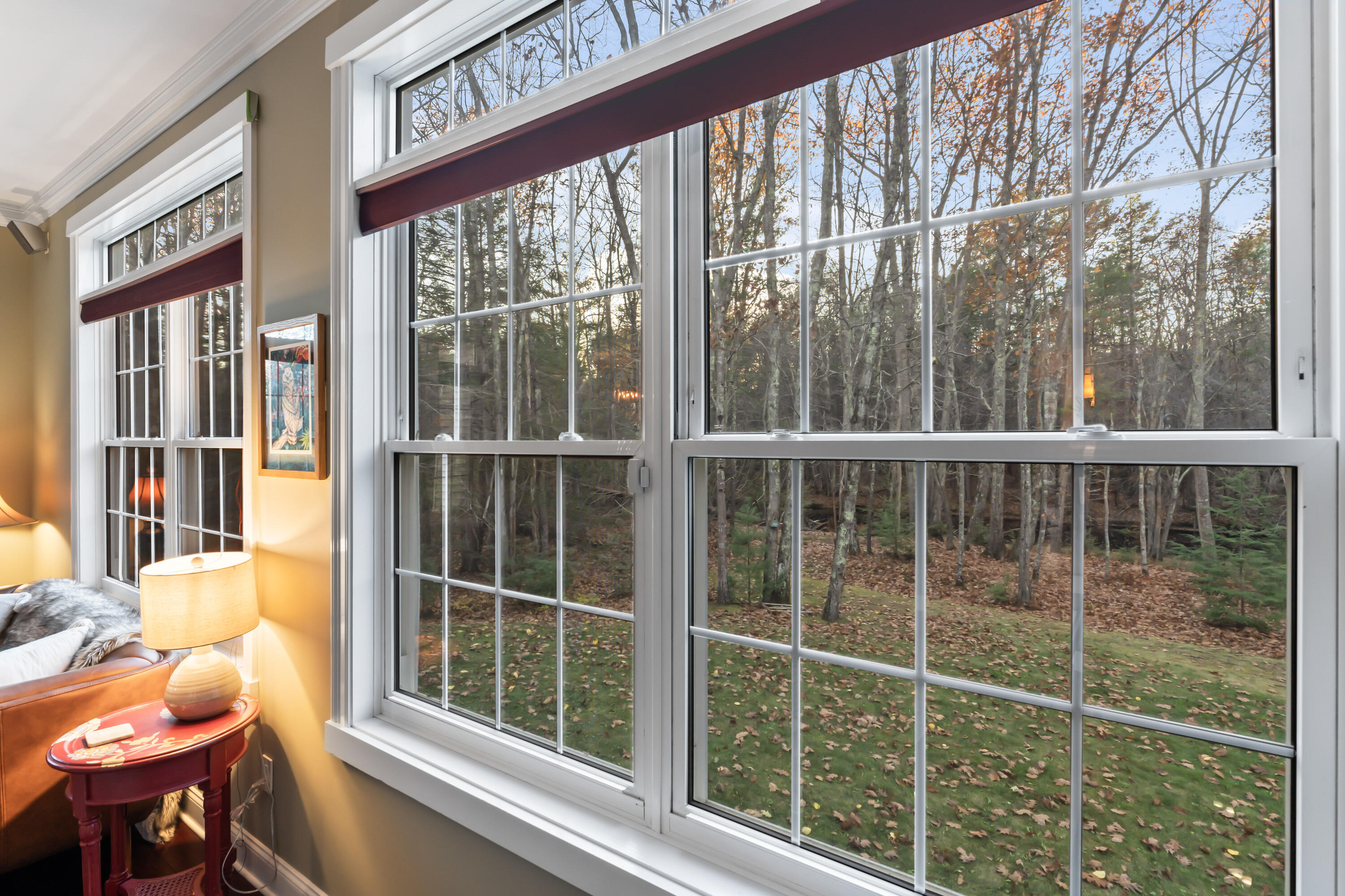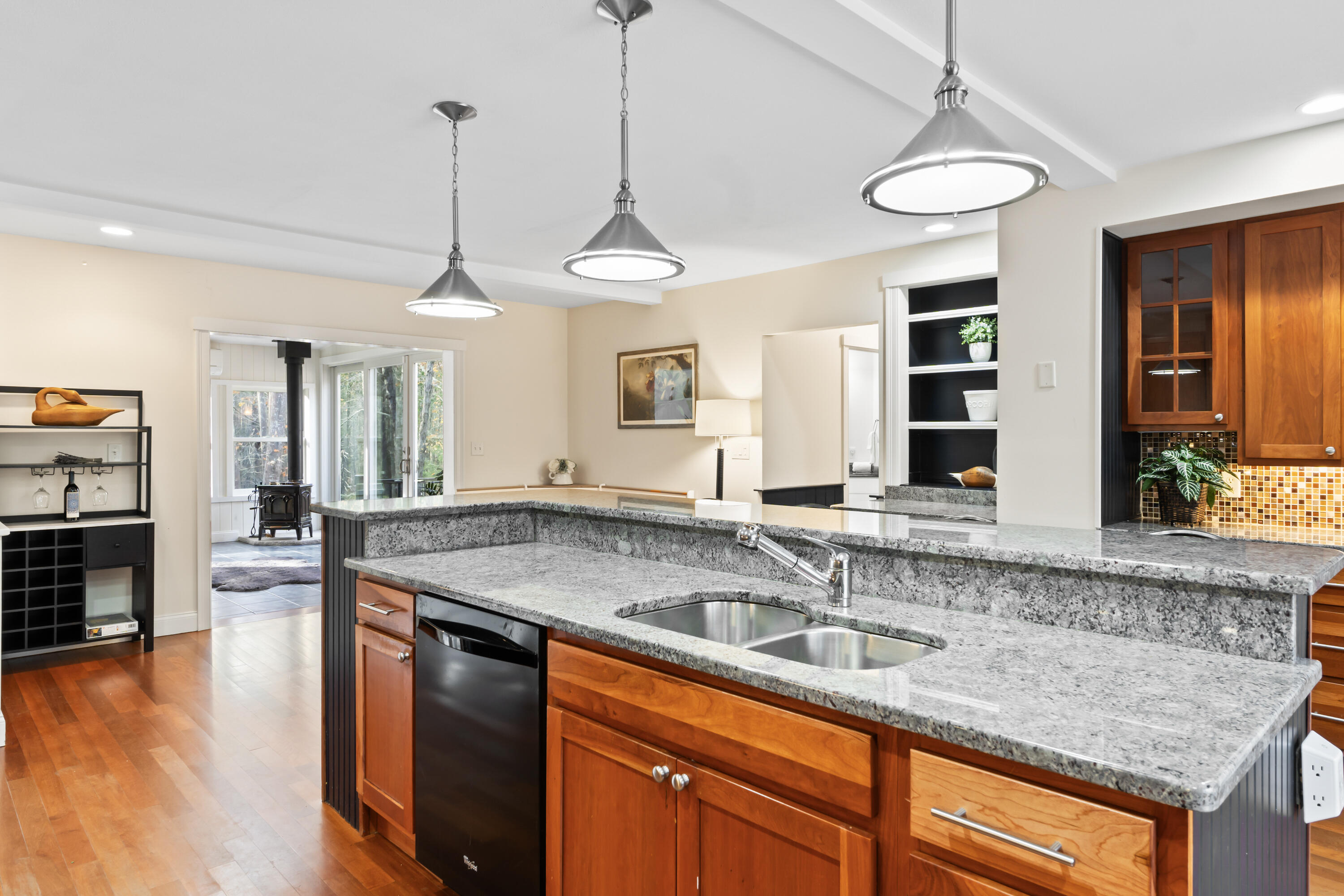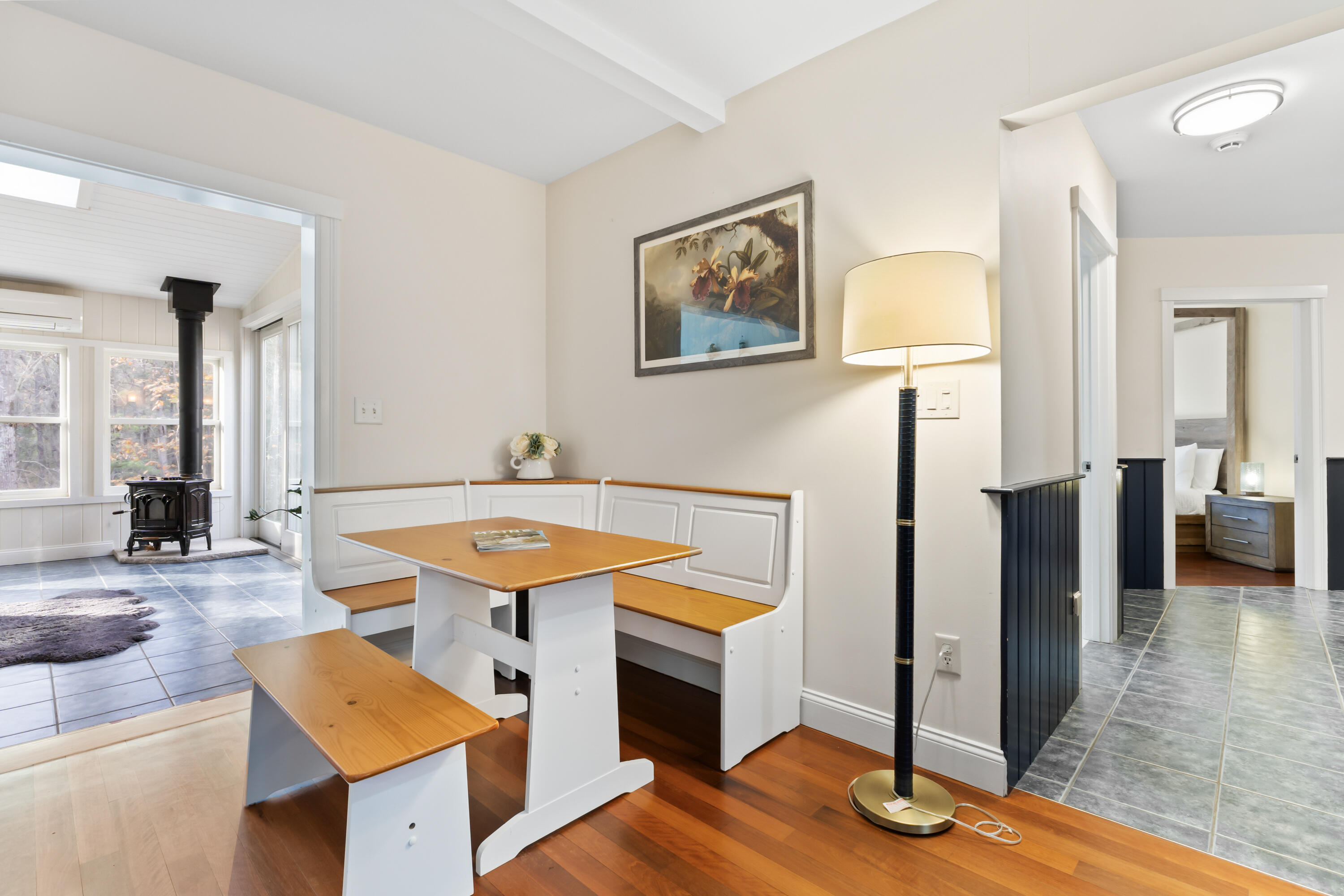 Outdoor living takes center stage here. Multiple tiered decks overlook the water, offering beautiful vantage points for morning coffee or sunset gatherings. A saltwater hot tub enhances the experience, while a tucked-away patio provides a quiet spot to relax. Whether you enjoy kayaking, casting a line, or simply watching the river drift by, this backyard delivers a true connection to nature. Inside, the home blends warmth with refined updates. The living room, anchored by a gas fireplace, flows comfortably into a formal dining space suited for holidays and special occasions. The kitchen is well-appointed with granite countertops and generous prep space, opening to a bright sunroom with vaulted ceilings, expansive windows, and a wood-burning stove. It's a welcoming space designed for all seasons, filled with natural light and scenic views.