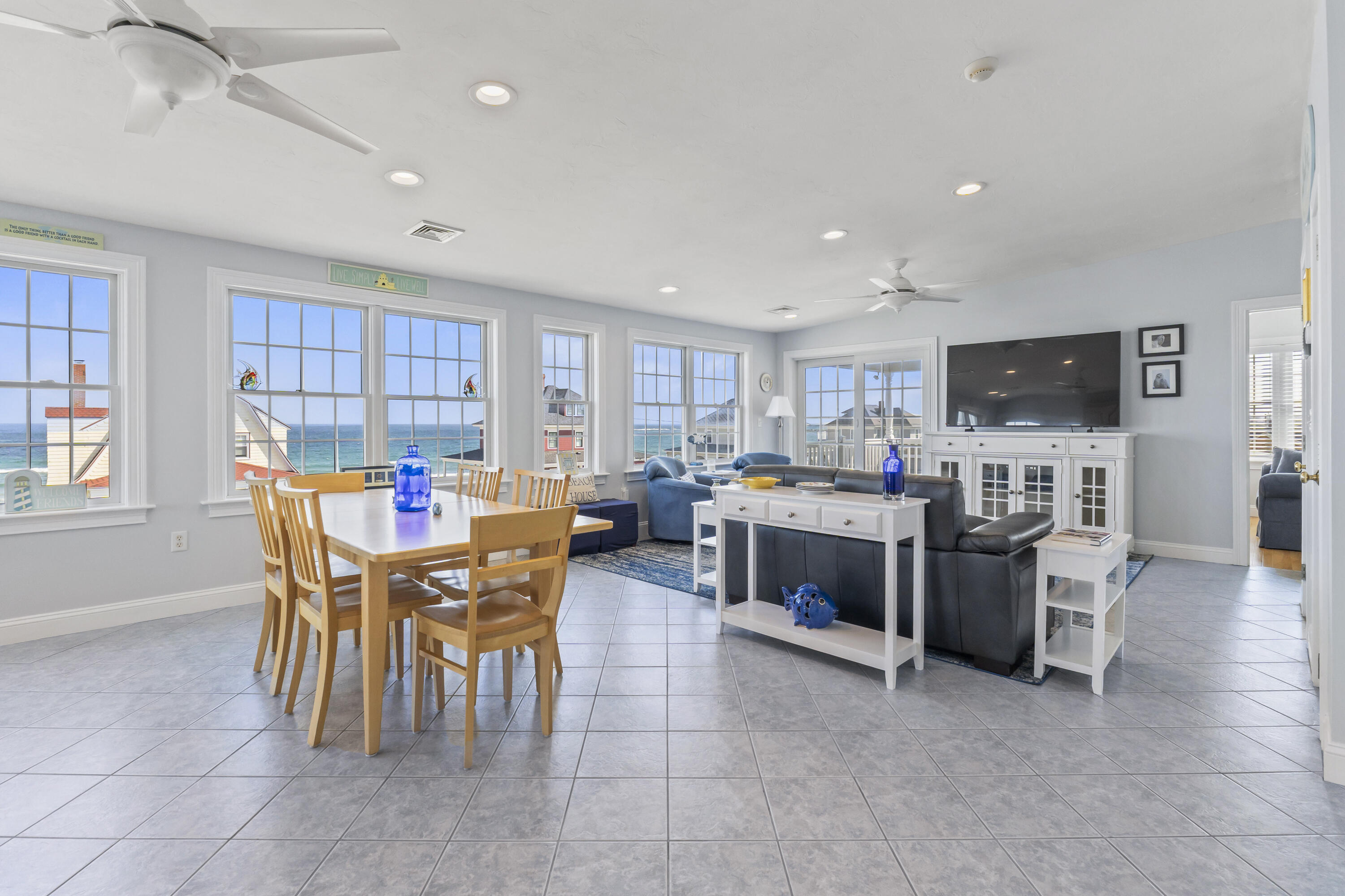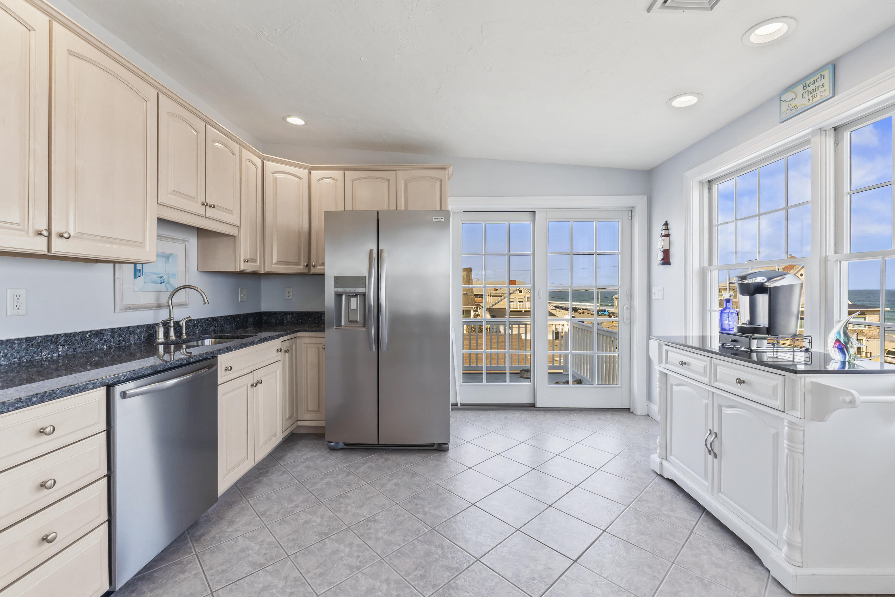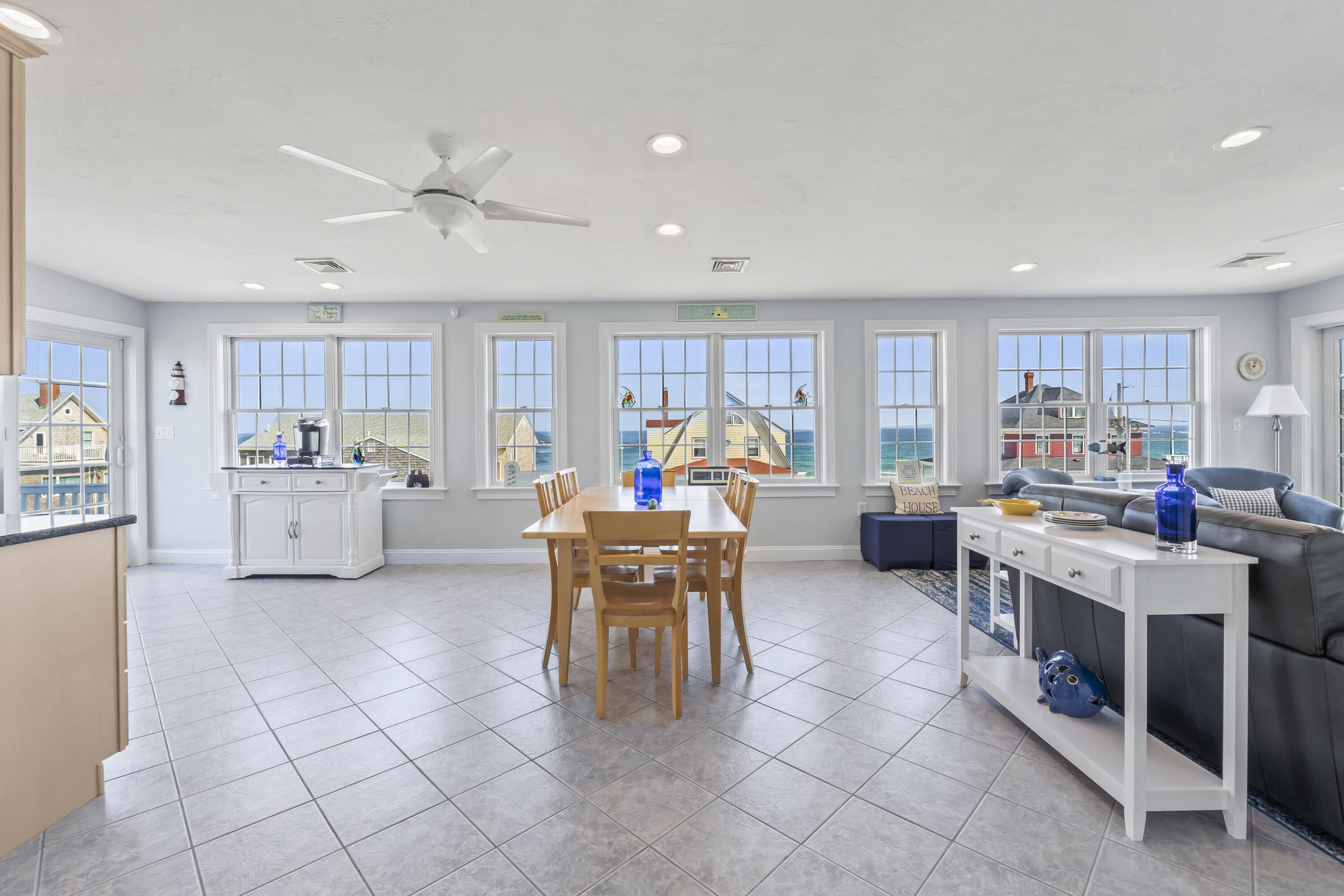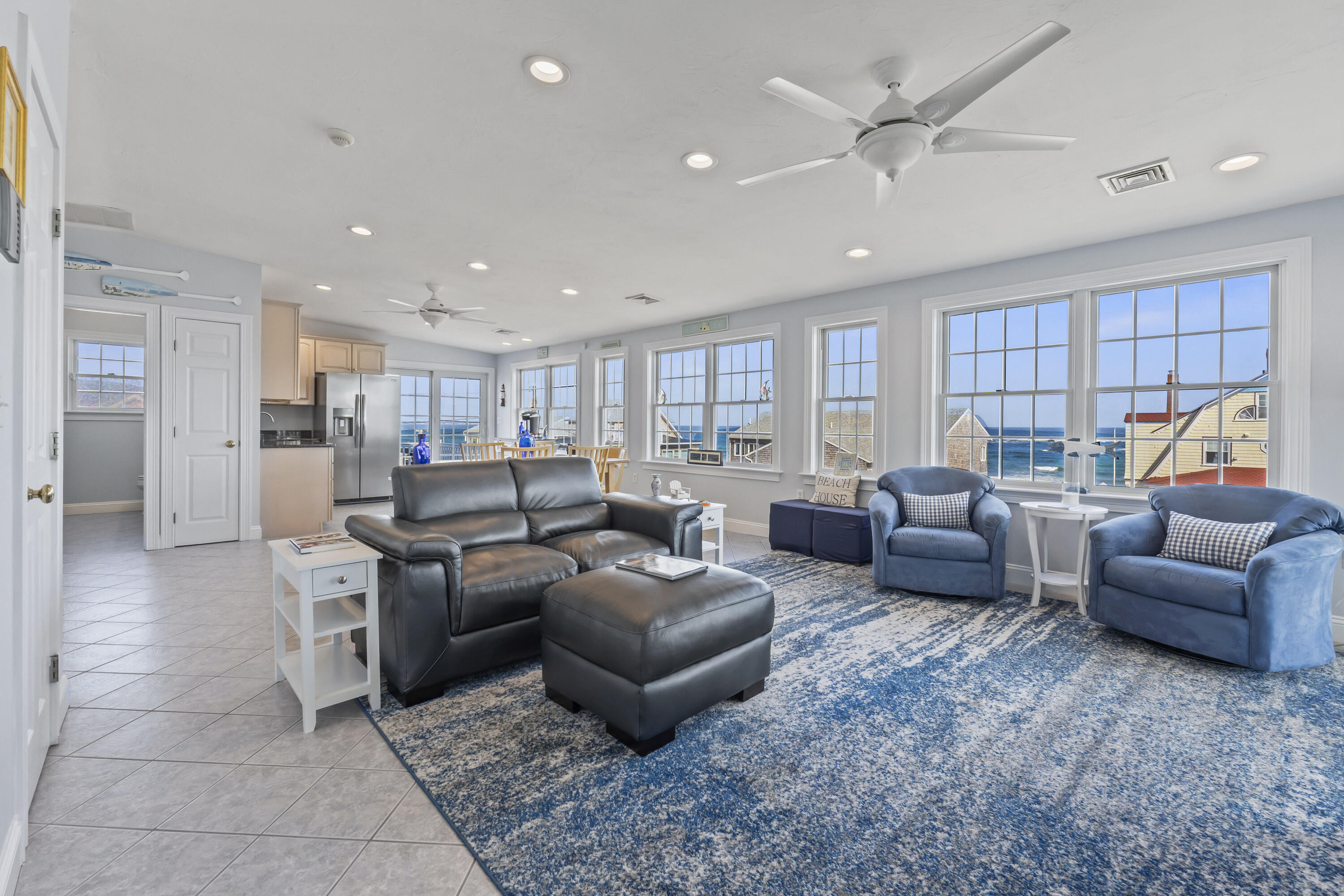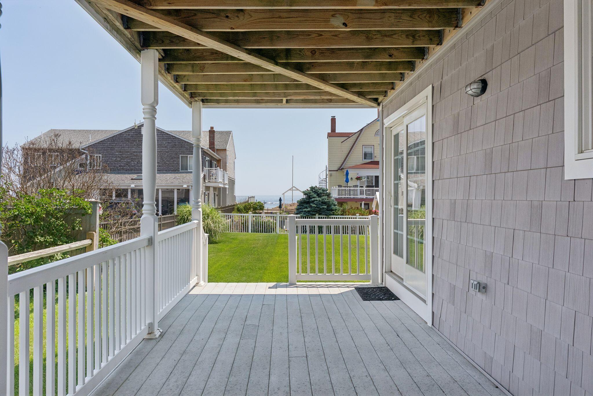 The main level offers a full kitchen, living and dining areas, a 4-season room, and four bedrooms including a primary suite. The upper and lower levels each include their own kitchenette, living space, bedrooms and baths, providing excellent flexibility and privacy. Ocean views, multiple decks, covered porch, hardwood and tile flooring, and abundant natural light through Andersen windows and sliders enhance the home's coastal appeal.
