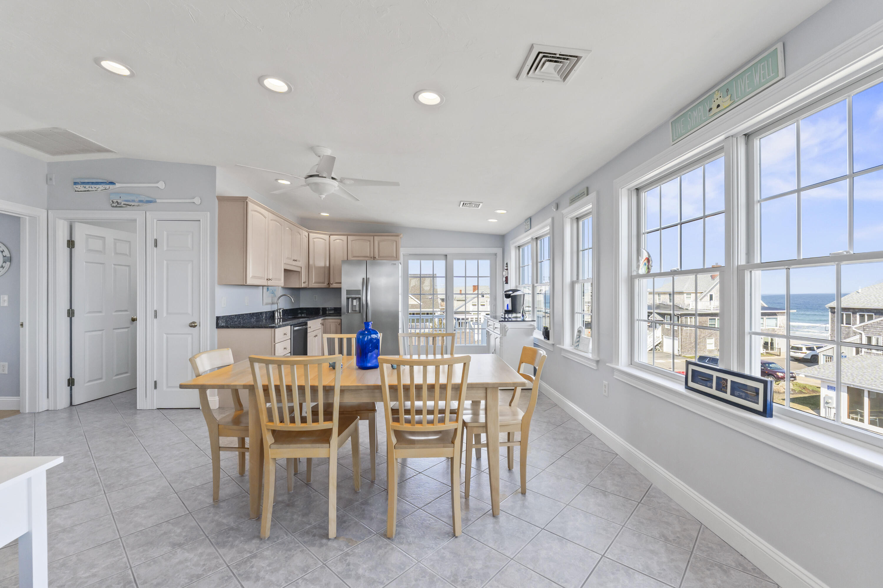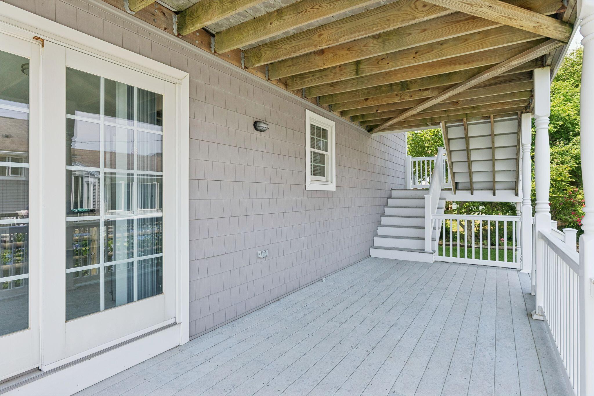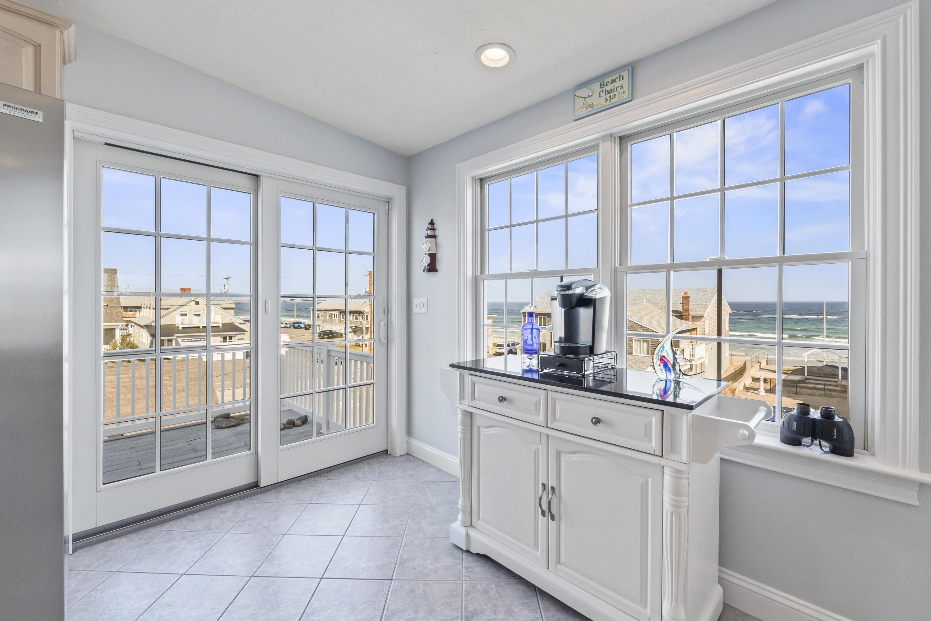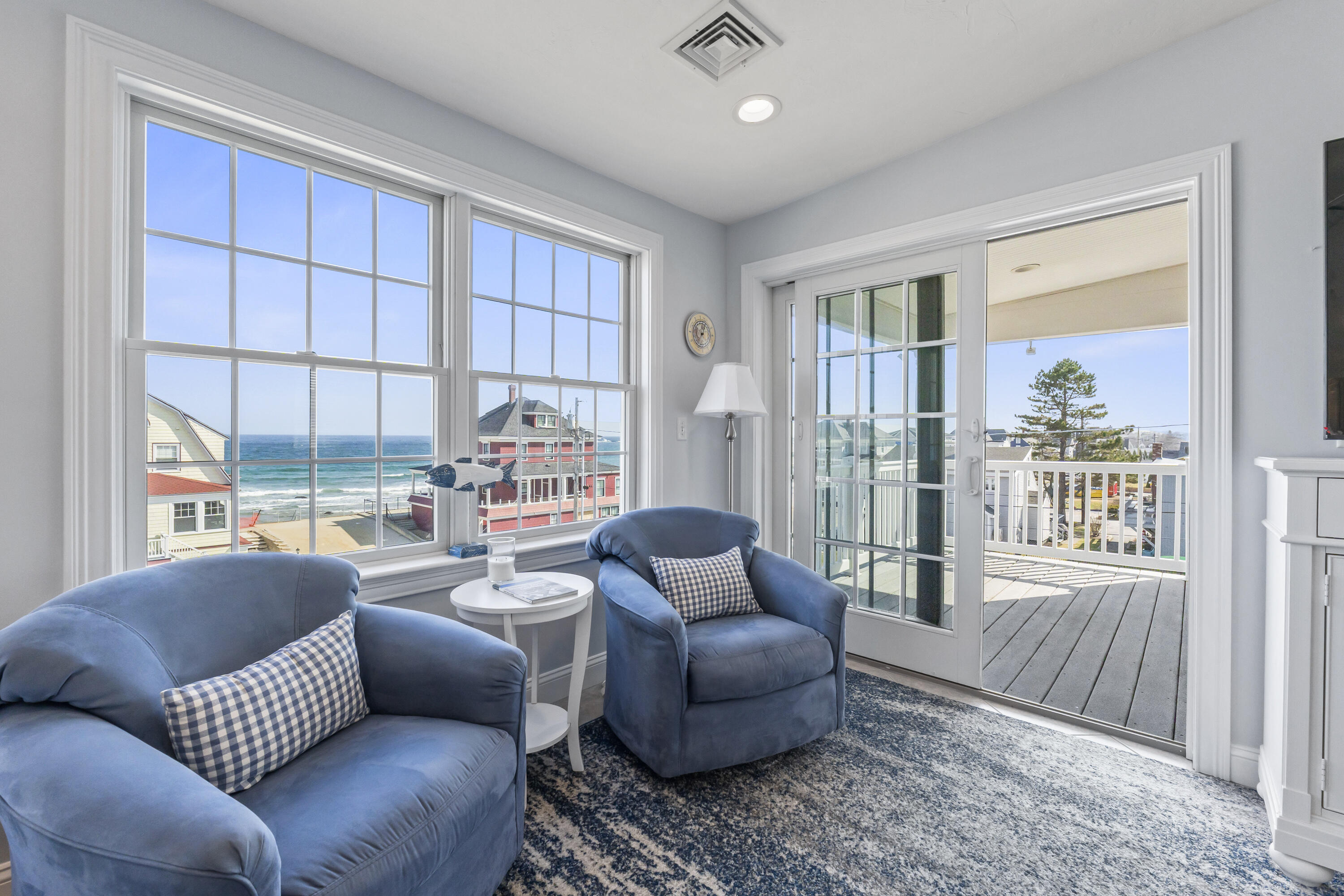 The main level offers a full kitchen, living and dining areas, a 4-season room, and four bedrooms including a primary suite. The upper and lower levels each include their own kitchenette, living space, bedrooms and baths, providing excellent flexibility and privacy. Ocean views, multiple decks, covered porch, hardwood and tile flooring, and abundant natural light through Andersen windows and sliders enhance the home's coastal appeal.