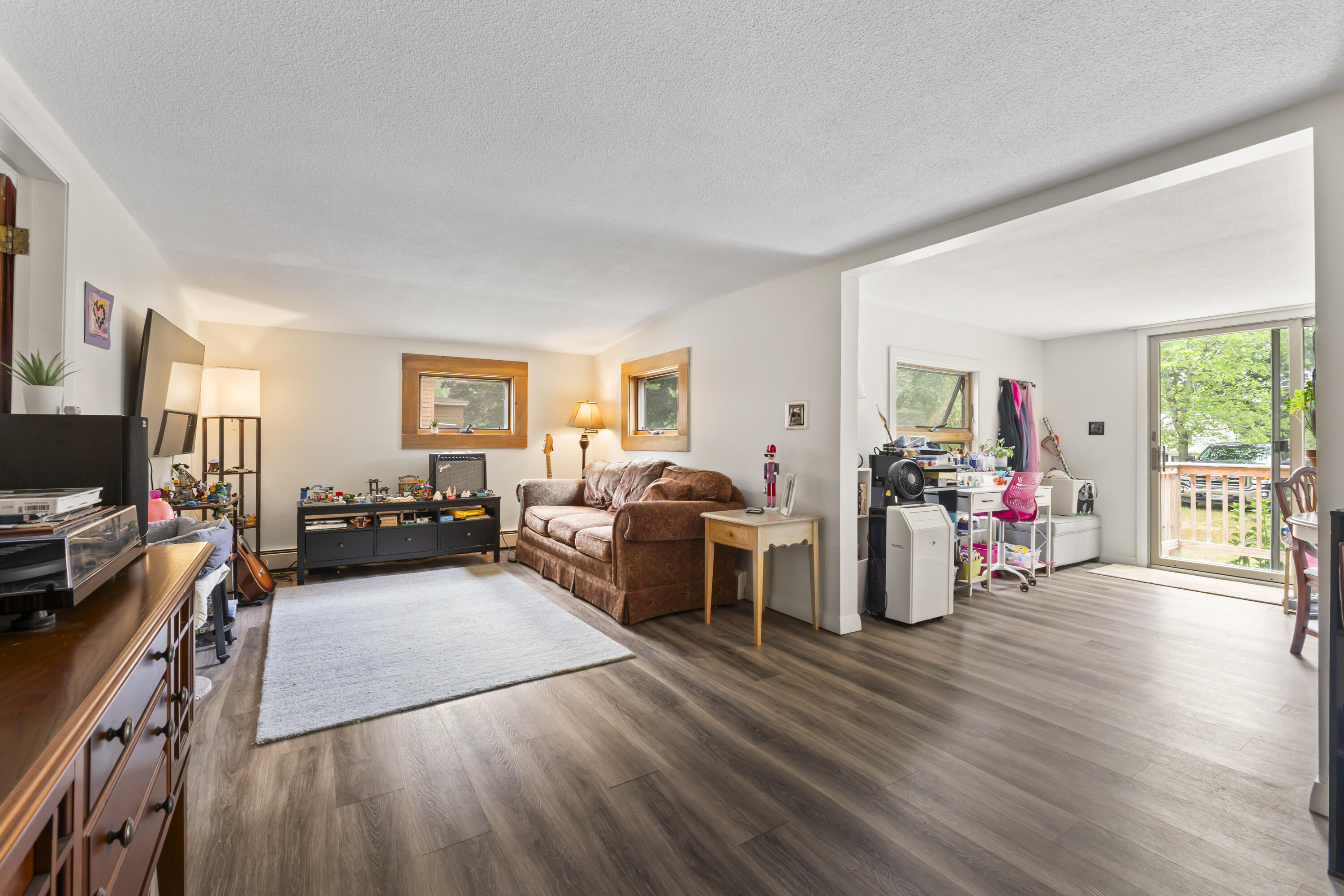 The main farmhouse, originally built in the 1800s, offers 1,992 square feet with 3 bedrooms and 3 bathrooms. Notable features include a generous mudroom entry, an inviting breakfast nook and living area centered around a striking stone wood-burning fireplace, a bright sunroom, formal dining room, and a galley-style kitchen with ample cabinetry. A spacious first-floor primary suite includes a full bath and walk-in closet, while an office, laundry area, and second full bath complete the main level. Upstairs are two additional bedrooms and a third full bath.